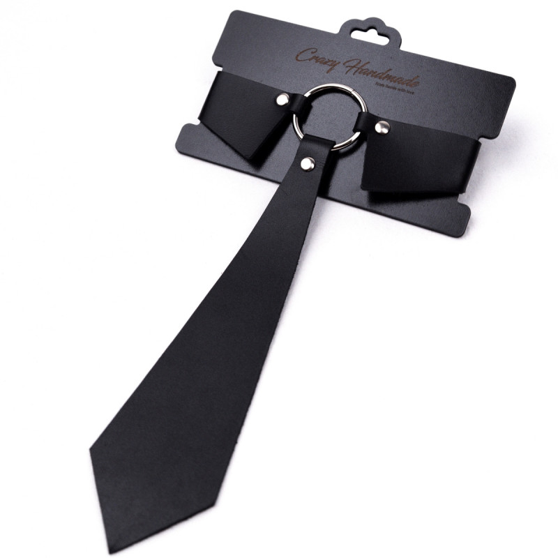 Однослойный чокер из натуральной кожи черного цвета классической прямоугольной формы. Декорирован элементом в виде маленького галстука-бабочки, прочно закрепленным на чокере.