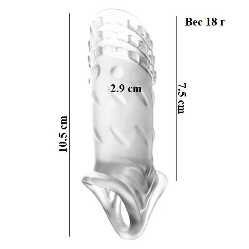 Закрытая насадка на пенис с кольцом для мошонки позволит увеличить размеры мужского полового органа. Небольшие пупырышки и рёбрышки на поверхности интимного аксессуара будут стимулировать эрогенные зоны.
